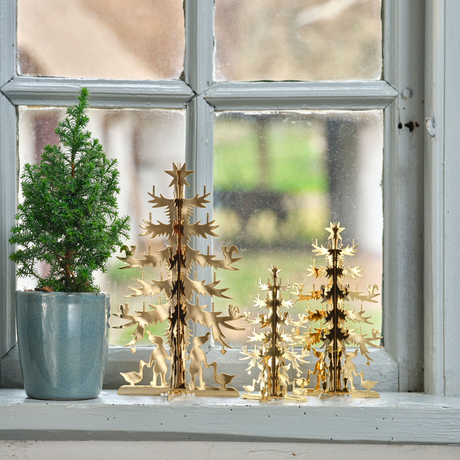 Dette juletræ er i forgyldt messing og 6 cm højt og fra Nordahl Andersen. Figuren er baseret på H. C. Andersens eventyr om Grantræet og hans smukke papirklip. Illustrationen af juletræet er med topstjerne. Originalklippet er i to lag og foldet på midten så det kan stå, med julenisser og gæs forneden. Eventyret om Grantræet Eventyret rummer et budskab, der rækker ud over den: Husk at skønne på dit liv her og nu! Lad være med at tro, at din lykke venter ude i fremtiden! Selv om fortællingen på overfladen handler om et grantræs korte liv, handler den således også om vor egen korte gang på jorden - og om, hvordan personlig forfængelighed kan stille sig i vejen for oplevelsen af den livsfylde, øjeblikket kan tilbyde. »Forbi! Forbi,« siger grantræet, da det til sidst i fortællingen ligger vissenbrunt i et hjørne af gårdspladsen: »Havde jeg dog bare glædet mig, da jeg kunne! forbi! forbi!«